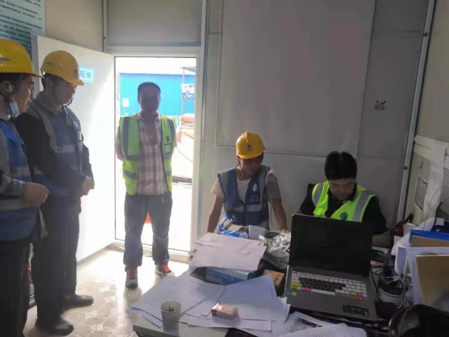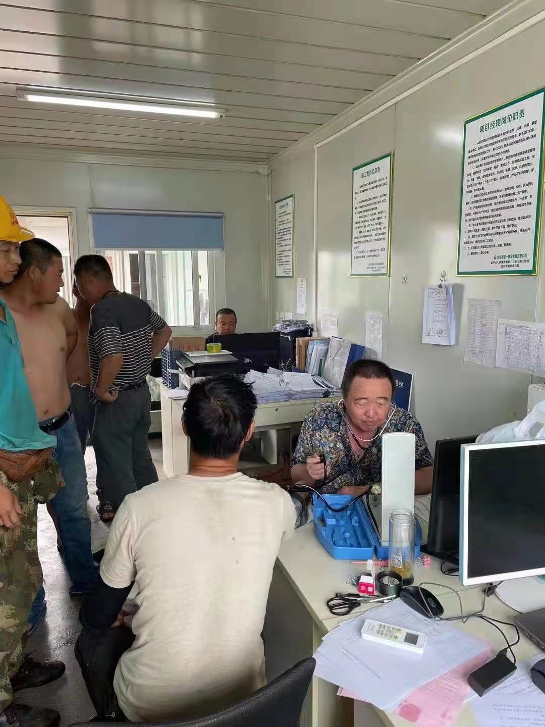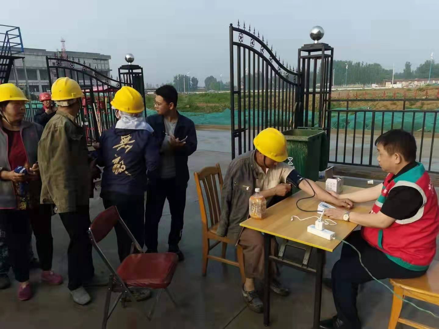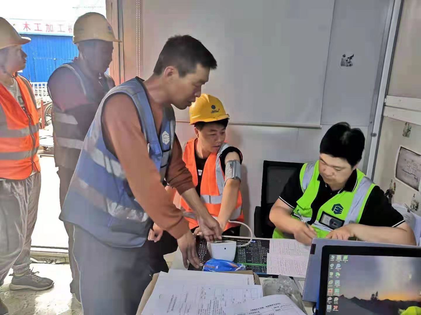 內(nèi)蒙東方國信項目,項目書記利用開早班會時間,親自給每位工人量血壓做記錄